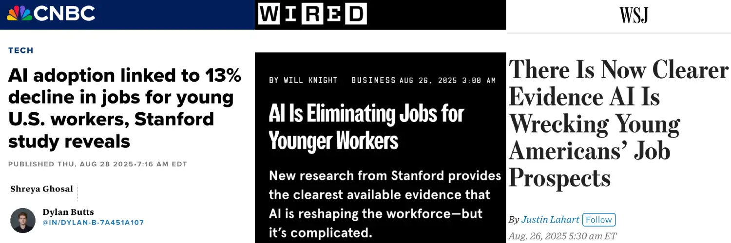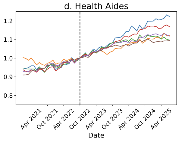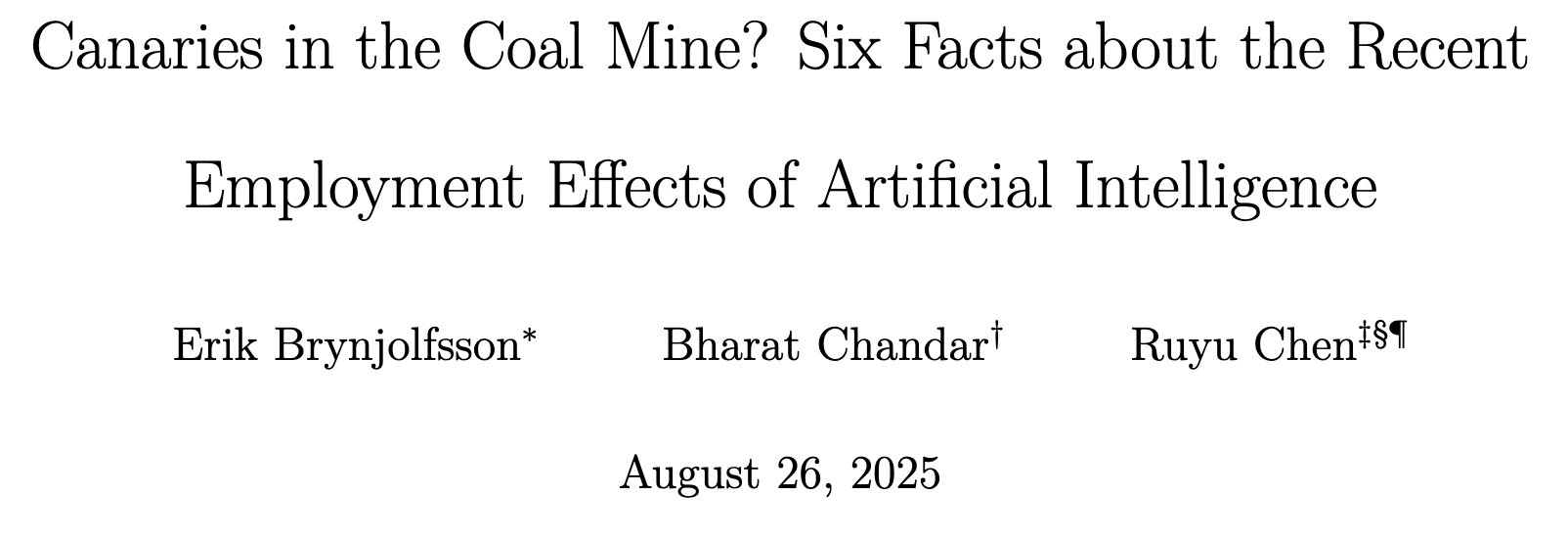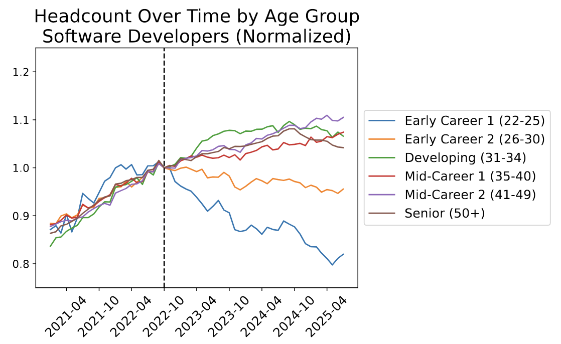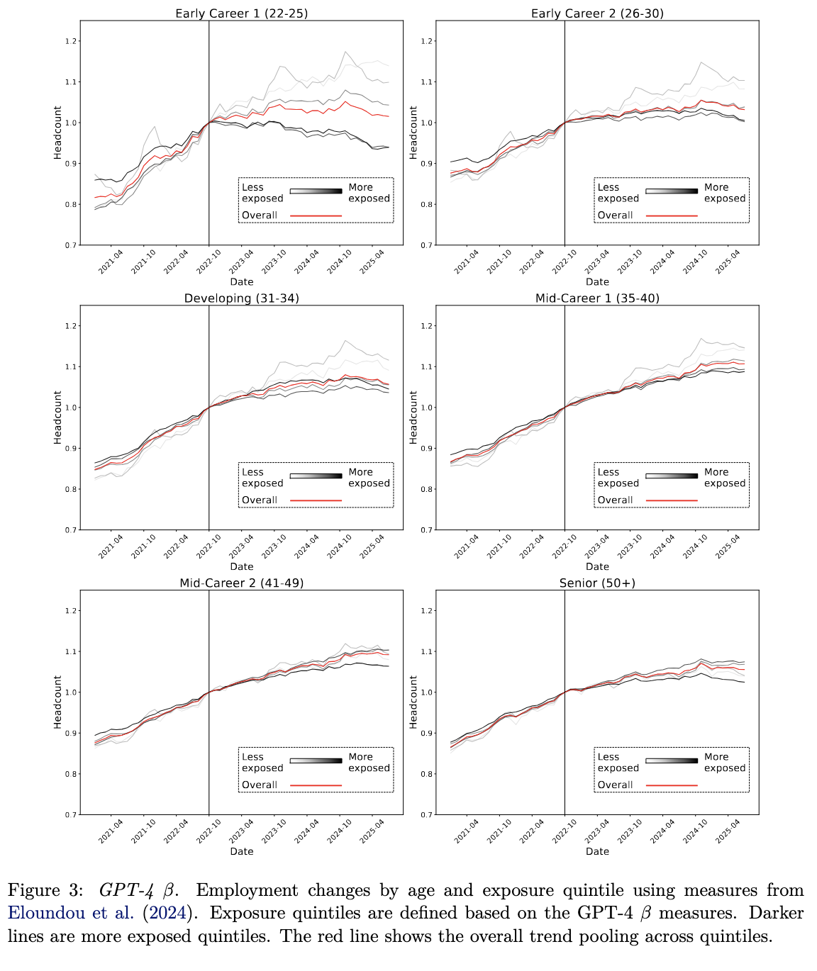 By David Gros. Last week a fascinating working paper came out of the Digital Economy Lab at Stanford studying impacts of AI on the labor market. AI unemployment angst grabs attention, and key results of the study were picked up by major outlets and around social media. How much do these alarming headlines hold up when digging into the paper? While I share the motivating concern of the articles (AI will probably automate most tasks and jobs in the coming decades, a view shared by many fellow “AI experts” (Grace et al., 2024)), the claims of the headlines might require deeper analysis and discussion. Here we’re going to explore the way the study reached this headline: loosely expressed that since the release of ChatGPT, AI has resulted in a ~13% drop in entry-level employment in areas most exposed to AI disruption (such as software jobs), and that this early-career employment drop is a surprising “canary” pointing to larger AI-driven patterns. Then we are going to think through two potential confounders that could deserve additional attention: Before getting to those questions, let’s understand a bit more of the study. The paper uses a really neat dataset. They get data from ADP, a maker of payroll software. After some filtering, this dataset has key data points for approximately 4 million American workers. For each job in the filtered data, there is a job title, which gets standardized into categories like “Software Developer”. The authors connect these job categories to “GPT-4 β exposure“ values, which are numbers from prior work by Eloundou et al. (2023) from OpenAI which approximates how automatable job types are by LLM systems (we subsequently refer to this as a job's β). The ADP data also has the birth year of every worker. They randomly choose a birth month for each person, and then calculate their age. They interpret age as a proxy for the experience of the worker, and organize workers into age brackets running from “Early Career 1 (22-25)” to “Senior (50+)”. This gives all the components for the main results. They highlight how jobs with high GPT-4 exposure β like software developers saw a decline of the lower age brackets while the higher age brackets stayed the same or increased. Grabbing from their Figure 1: Meanwhile a lower β job like Health Aides do not have this pattern. Grabbing from their Figure 2: Looking at quintiles of job β they note a similar trend. Here we quote their conclusions to summarize key claims of the paper: We document six facts about the recent labor market effects of artificial intelligence: • First, we find substantial declines in employment for early-career workers in occupations most exposed to AI, such as software development and customer support. • Second, we show that economy-wide employment continues to grow, but employment growth for young workers has been stagnant. • Third, entry-level employment has declined in applications of AI that automate work, with muted effects for those that augment it. • Fourth, these employment declines remain after conditioning on firm-time effects, with a 13% relative employment decline for young workers in the most exposed occupations. • Fifth, these labor market adjustments are more visible in employment than in compensation. • Sixth, we find that these patterns hold in occupations unaffected by remote work and across various alternative sample constructions. While our main estimates may be influenced by factors other than generative AI, our results are consistent with the hypothesis that generative AI has begun to significantly affect entry-level employment. We’re glossing over a lot of details here. We refer back to the full paper for more, but these are the key details needed to get into potential nuance, and discuss why many of these conclusions seem confusing. The study divides workers into age brackets. There are few ways to do this, but it appears the most sensible read of the paper implies they recalculate the brackets at every time step. They normalize the counts for each bracket to 1.0 is the number of jobs in that bracket in Nov 2022. This methodology appears to have concerning implications. The headline result is the 13% decline in the 22-25 Early Career bracket. However, notably, this bracket is only 4 years wide and will be most affected by slow hiring. Imagine a case where hiring completely froze across all ages without any layoffs. The youngest bracket would naturally lose approximately a quarter of its population each year as 25yos aged into the 26-30yo bracket. To illustrate we plot a simulation of a complete hiring freeze of the Software Developers (a high β job). In this scenario there are no layoffs, but existing workers age over time. We don’t have access to the Brynjolfsson et al.'s data and they do not report the non-normalized counts, so we approximate the starting demographics using data from the Bureau of Labor and Statistics Current Population Survey (BLS CPS) (Flood et al., 2024) averaging the monthly data across all of 2024. The CPS data interviews 60,000 households per month (only small fraction have any given job), thus this data is very noisy for this use case, but gives an approximate age demographic curve. In this extreme full hiring freeze, the “Early Career” bracket drops about 64% as the demographic moves up. There was not a complete hiring freeze post-ChatGPT. However, for reasons not attributable to AI (as discussed below), there might have been slower hiring than in 2022. Any slow will naturally affect the youngest bracket the most, and we should avoid excessively inferring from this. Demographic differences between jobs might exaggerate or soften this effect. Bottom Line: Early career positions might be declining in high β sectors. However, the data might not imply connection between AI and employee experience as claimed, or that the market for a 22yo in high GPT-4-β roles is more suppressed than for a 35yo, but inste